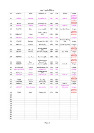 Le document présente une liste d'inscrits pour une course de 19 km, comprenant les noms, prénoms, villes de naissance, dates de naissance, catégories, et associations des participants. Certains participants doivent fournir un certificat médical, tandis que d'autres ont complété leur inscription. La liste inclut divers coureurs représentant plusieurs clubs et régions.