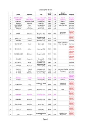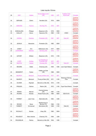 Le document présente une liste d'inscrits pour une course de 19 km, incluant les noms, prénoms, villes de naissance, catégories d'âge et informations sur leur dossier médical. Chaque participant est identifié avec des détails sur la complétude de leur dossier, certains devant présenter un certificat médical. La liste comprend des coureurs de différents clubs et villes, et indique les conditions d'inscription requises.