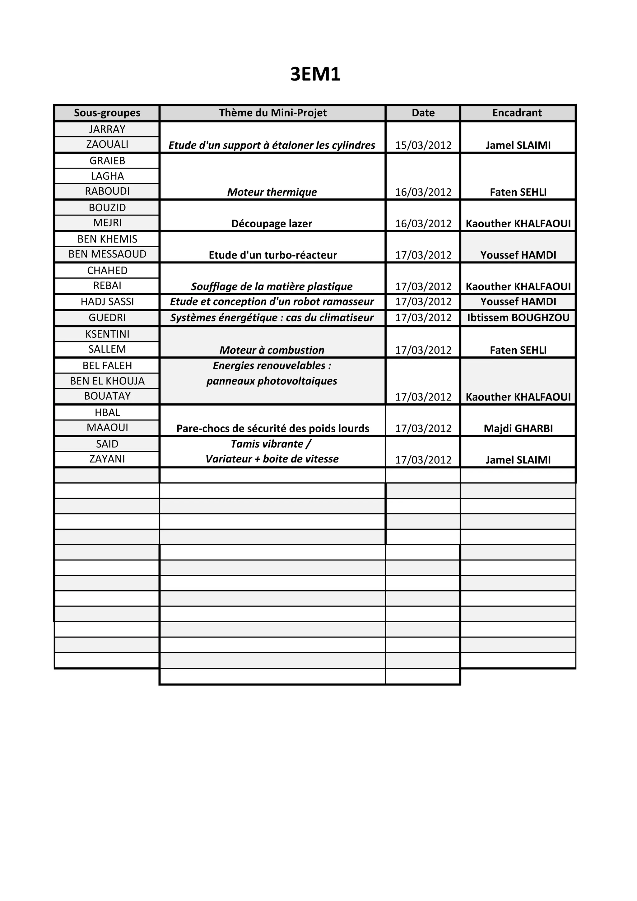 Le document présente une liste de mini-projets réalisés par des étudiants, avec des détails sur les sous-groupes, les thèmes, les dates et les encadrants. Chaque projet aborde un sujet technique spécifique, allant de l'étude de moteurs thermiques à la conception de robots. Les projets sont tous programmés pour être présentés autour de la date du 17 mars 2012.
