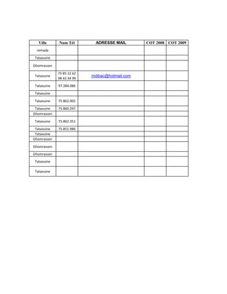Ville Num TélADRESSE MAIL COT 2008 COT 2009