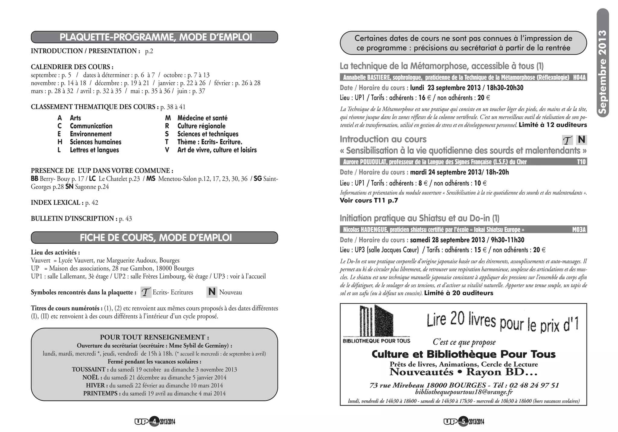 Le document présente un programme de cours proposé par une université populaire, comprenant des informations sur le calendrier, les tarifs, et les thèmes des différentes formations, telles que la technique de la métamorphose et des langues vivantes. Il détaille les lieux d'activités, les modalités d'inscription et les interventions de divers formateurs. Des précisions sur les horaires et les objectifs des cours sont également fournies, ainsi que des informations sur l'accueil durant les vacances scolaires.