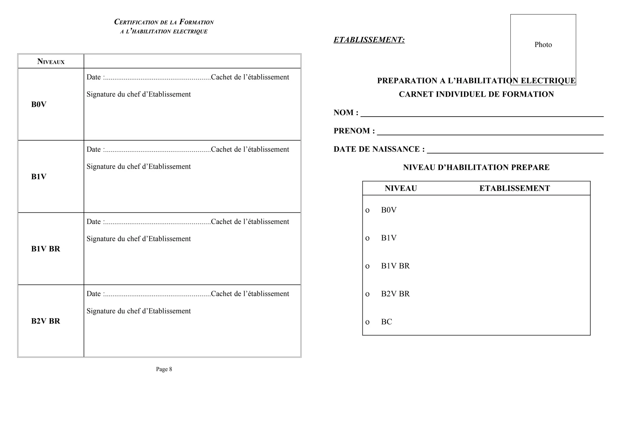 Le document présente une certification de formation à l'habilitation électrique, indiquant les niveaux d'habilitation et les compétences requises pour les élèves. Il décrit les objectifs de la formation, qui incluent la compréhension des risques électriques et l'exécution de tâches sécurisées, ainsi que les modalités de validation des compétences. Les programmes de formation sont divisés en théorie et pratique, avec des tests pour assurer la conformité aux exigences réglementaires.