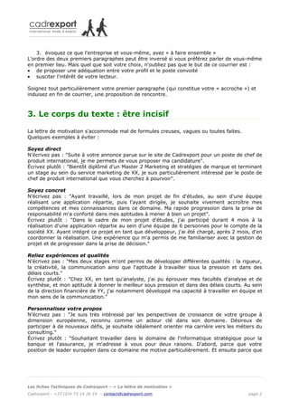 La lettre de motivation doit être concise et souligner l'adéquation entre le profil du candidat et les besoins de l'entreprise, en évitant les résumés de CV. Elle se structure en trois parties principales : votre intérêt, la pertinence de votre candidature, et ce que vous pouvez réaliser ensemble avec l'entreprise. Il est crucial d'être direct, concret et d'éviter les erreurs fréquentes comme les fautes d'orthographe ou l'envoi de lettres à des adresses incorrectes.