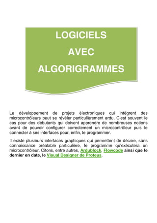 Le document traite des outils de développement pour les projets électroniques intégrant des microcontrôleurs, en mettant l'accent sur des logiciels comme Ardublock, Flowcode et le Visual Designer de Proteus qui facilitent la programmation pour les débutants. Ardublock permet de créer des algorigrammes sans écrire de code, tandis que Flowcode et Visual Designer offrent des solutions plus avancées pour des applications complexes. Ces outils améliorent l'accessibilité à la programmation des cartes Arduino, rendant l'apprentissage plus intuitif et rapide.