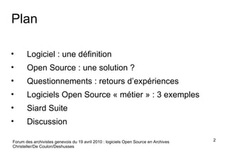 Le document traite des logiciels open source dans le domaine des archives, en abordant leur définition, leur rôle et les différents types d'outils disponibles. Il présente également les avantages et inconvénients de l'open source, tout en soulignant l'importance des licences et des normes pour leur utilisation. Enfin, le texte évoque les retours d'expérience et les questionnements des archivistes concernant l'intégration de ces solutions dans leur travail.