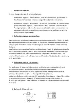 Le document traite des fonctions logiques combinatoires et séquentielles, expliquant leurs principes fondamentaux et leurs applications dans les systèmes logiques. Il aborde des concepts tels que l'algèbre de Boole, les portes logiques, les bascules, les registres et les compteurs, en illustrant leur fonctionnement à travers des schémas et tables de vérité. La conclusion souligne l'importance de distinguer entre la logique combinatoire et la logique séquentielle dans les systèmes logiques.