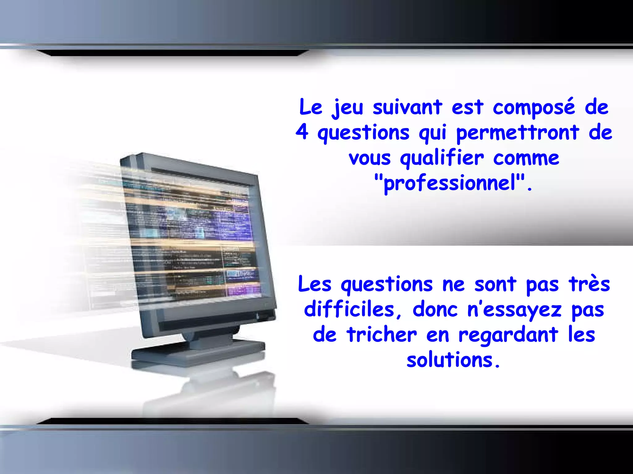 Le document présente un quiz humoristique composé de quatre questions visant à évaluer la pensée critique et la mémoire des participants. Les résultats d'Andersen Consulting montrent que 90% des professionnels échouent, tandis que des enfants de maternelle obtiennent de bonnes réponses. L'objectif est de souligner les lacunes de raisonnement chez les adultes par rapport aux enfants.