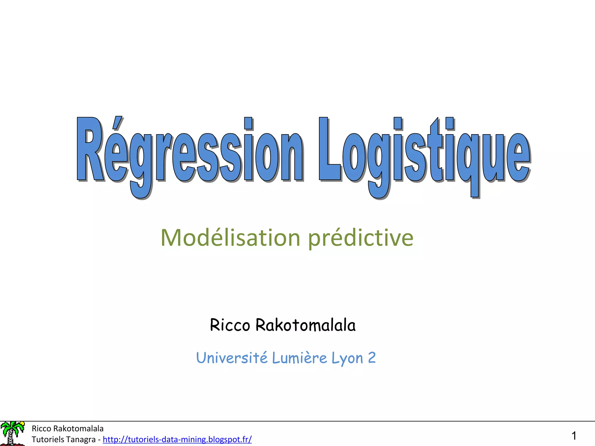 Ce document traite de la régression logistique, une méthode statistique de modélisation prédictive largement utilisée pour les classifications binaires et multiclasse. Il aborde les fondements théoriques, l'estimation des coefficients et les algorithmes d'optimisation, notamment la maximisation de la vraisemblance et la descente de gradient. En outre, des exemples pratiques, incluant un jeu de données sur le cancer du sein, sont discutés pour illustrer l'application de ces concepts.
