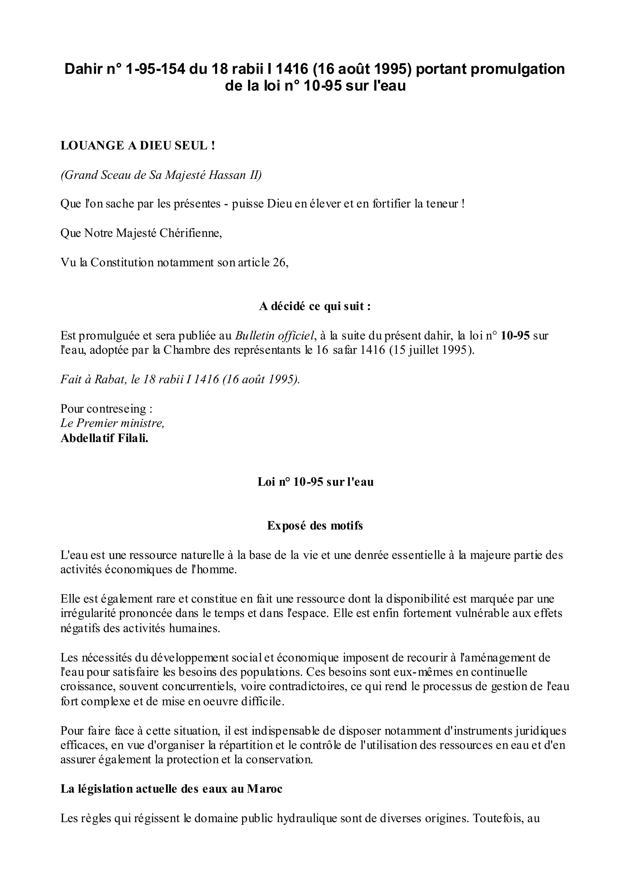 Le dahir n° 1-95-154 promulgue la loi n° 10-95 sur l'eau, visant à réformer et unifier la législation marocaine sur l'eau pour répondre aux besoins de développement économique et social. Cette loi instaure une gestion décentralisée des ressources en eau, crée des agences de bassins pour la planification et la gestion, et établit des principes de protection et de rationalisation de l'utilisation de l'eau. Son objectif est d'assurer une politique nationale de l'eau qui garantit l'accès équitable et la durabilité des ressources en eau dans le pays.