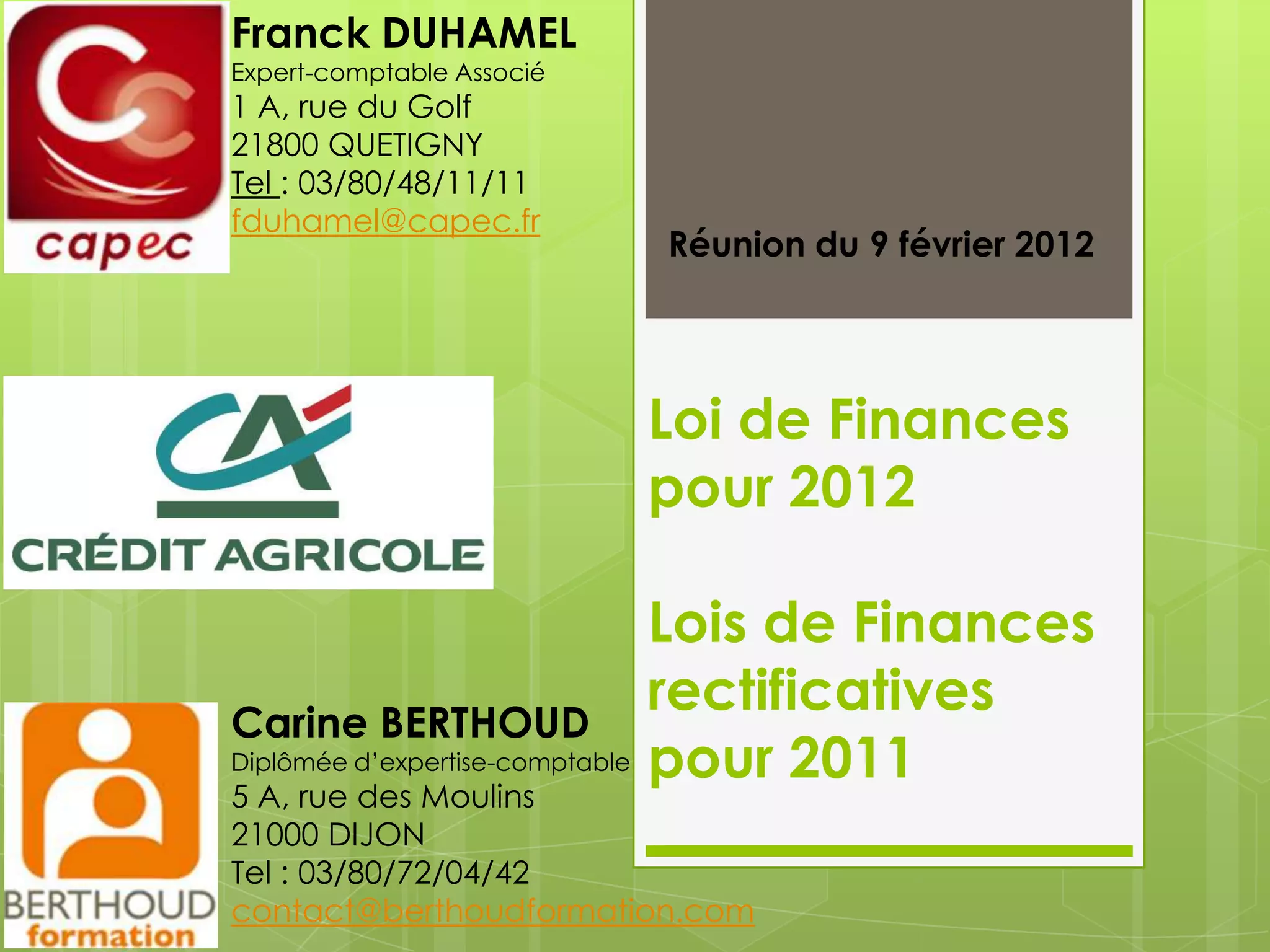 Le document présente un aperçu des prévisions économiques pour 2012, soulignant la nécessité de réduire le déficit à 4,5% du PIB, tout en détaillant les différents aspects des lois de finances rectificatives pour 2011 et les mesures fiscales 2012, y compris des modifications de l'impôt sur le revenu, de la TVA et des plus-values. Il mentionne également des dispositifs d'investissement pour les PME et des réformes affectant la fiscalité des particuliers et des entreprises. Enfin, le texte aborde des questions comme l'ISF, le bouclier fiscal et la taxation sur les boissons sucrées.