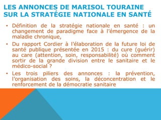 Le document aborde la stratégie nationale de santé, axée sur la prévention et l'amélioration de l'accès aux soins, notamment pour les personnes en situation de handicap. Il souligne l'importance de structurer les soins de proximité, d'impliquer les usagers dans les décisions de santé, et de diversifier l'offre médico-sociale. Les chiffres clés de la MDPH révèlent une augmentation des demandes et des délais de traitement, tout en mettant en lumière des défis dans la prise en charge des personnes handicapées.