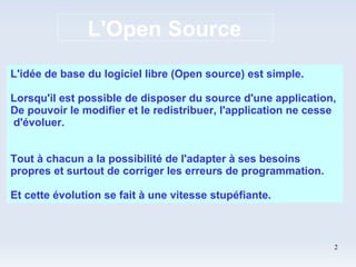 Le document traite de l'open source et du logiciel libre, mettant en avant leur histoire, principes et différences. Richard Stallman a fondé la Free Software Foundation pour promouvoir la liberté des logiciels, définissant quatre libertés fondamentales pour les logiciels libres. Il souligne également les ambiguïtés liées aux terminologies 'libre' et 'open source', ainsi que les dangers associés à la transformation de logiciels libres en logiciels propriétaires.
