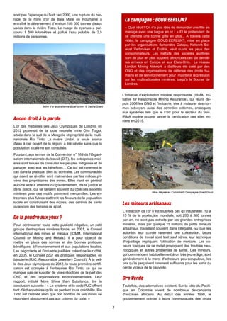 Le document traite de l'exploitation minière de l'or, soulignant les conséquences écologiques et sociales négatives liées aux pratiques industrielles et artisanales. Il met en lumière les initiatives pour un or équitable et responsable, ainsi que les défis rencontrés pour garantir une véritable traçabilité et des conditions de travail décentes pour les mineurs. Des alternatives artisanales et durables, comme celles mises en place par des coopératives en Amérique latine, sont présentées comme des solutions prometteuses face à l'exploitation conventionnelle destructrice.
