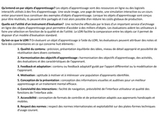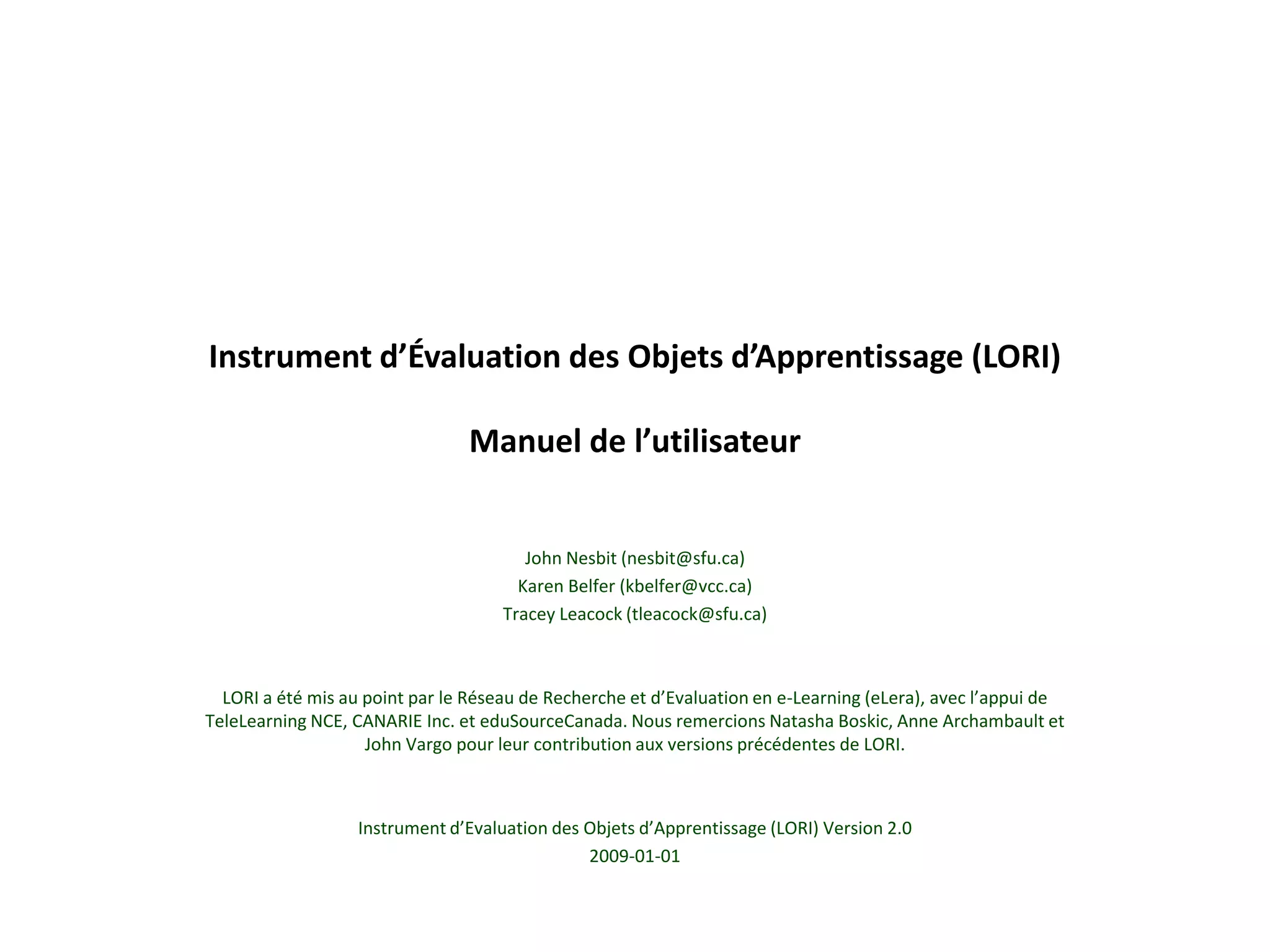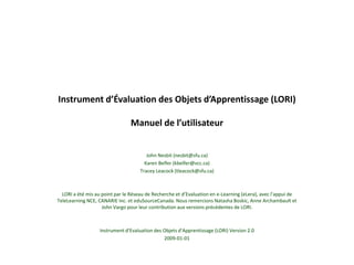 Le LORI (Learning Object Review Instrument) est un outil d'évaluation conçu pour analyser la qualité des objets d'apprentissage en ligne selon huit critères, incluant la qualité du contenu et l'accessibilité. Il permet aux évaluateurs de noter et de commenter les objets d'apprentissage, facilitant la comparaison et la sélection en fonction de leur qualité. Ce manuel fournit des directives sur l'utilisation du LORI et des exemples de notation pour chaque critère.