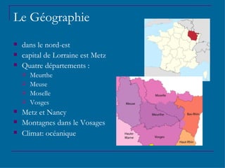 La Lorraine, avec Metz pour capitale, est composée de quatre départements et se caractérise par son climat océanique et ses paysages montagnards. La région est marquée par une histoire tumultueuse entre la France et l'Allemagne, notamment durant les deux guerres mondiales, et attire le tourisme grâce à ses sites historiques, comme les champs de bataille de Verdun et la cathédrale Saint-Étienne. La gastronomie lorraine offre des spécialités telles que la quiche lorraine et le vin de Côtes de Toul.