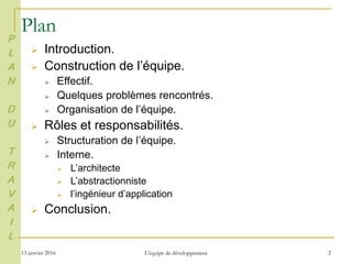Le document traite de l'importance de la formation et de l'organisation des équipes de développement logiciel, soulignant que les personnes sont essentielles pour le succès d'un projet. Il aborde la construction d'équipes, les rôles et responsabilités des différents membres, ainsi que les problèmes potentiels rencontrés lors de la gestion d'un projet. En conclusion, il insiste sur la nécessité d'une équipe soudée et bien structurée pour atteindre les objectifs fixés.