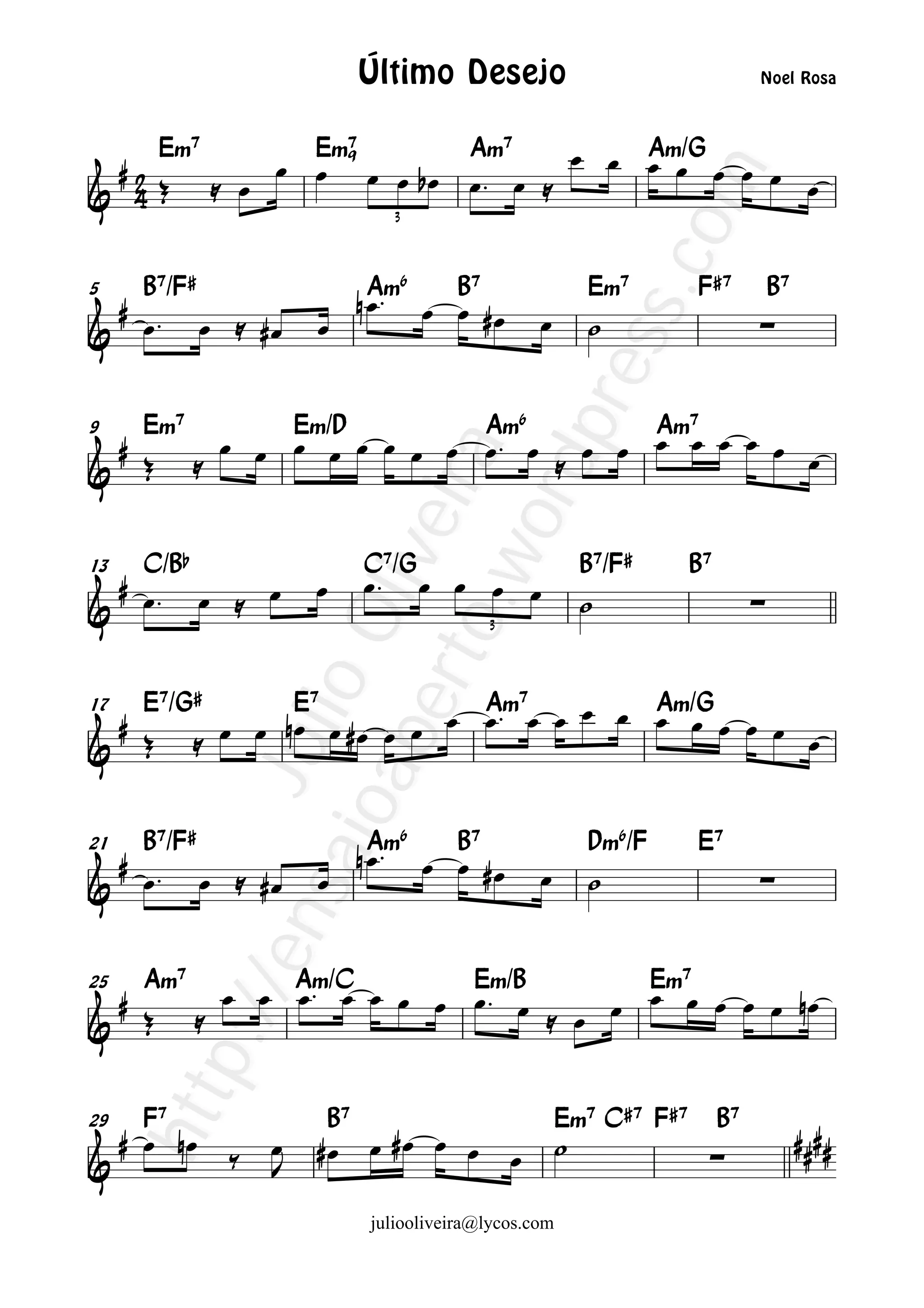 Le document semble être une transcription musicale, comprenant des accords et des annotations pour une composition appelée 'Último Desejo'. Plusieurs sections et transitions de musique sont notées, avec des informations de contact à la fin. Il inclut également des morceaux d'identification des accords utilisés tout au long de la pièce.