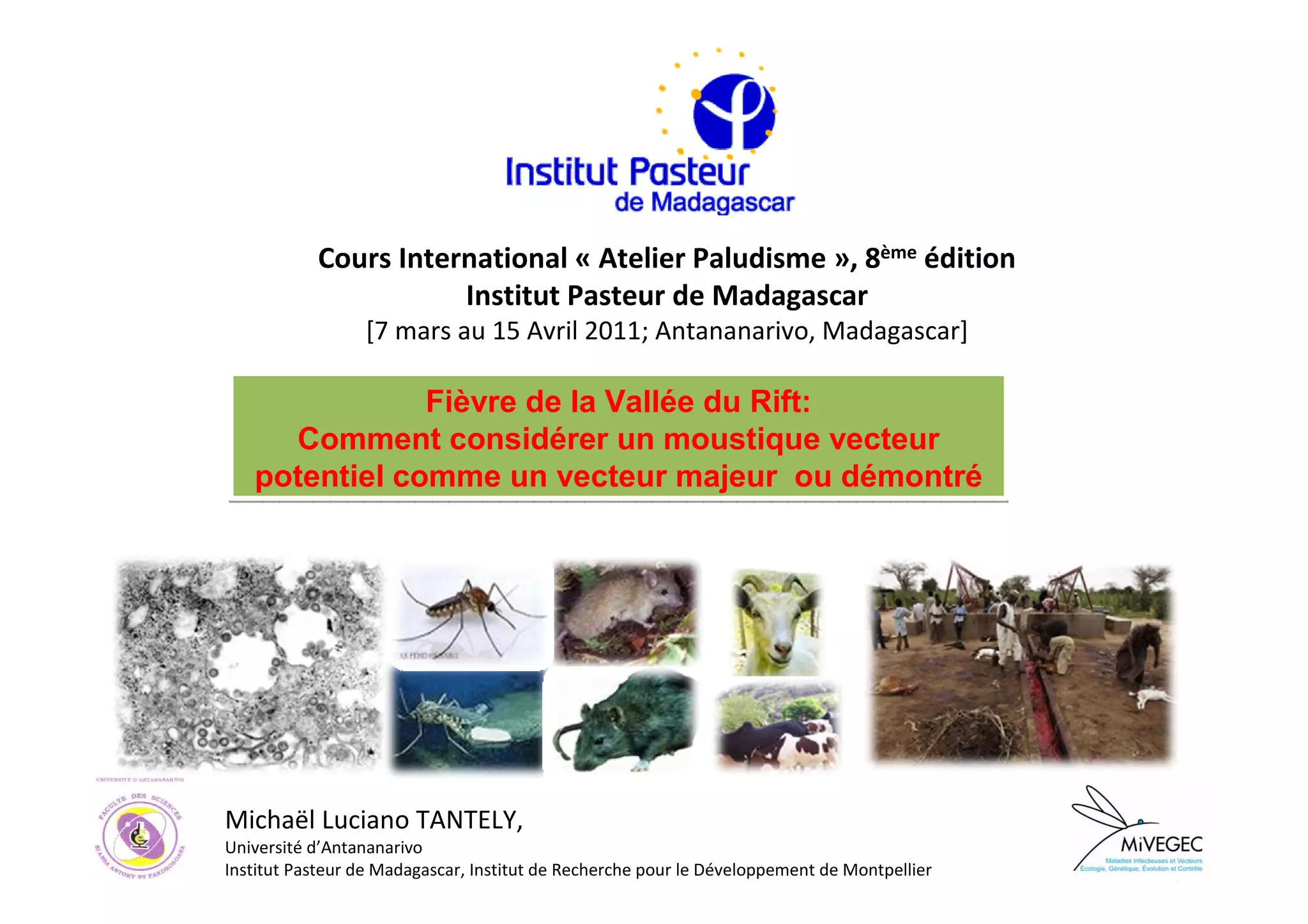 Le document concerne l'atelier sur la fièvre de la vallée du rift qui s'est tenu à Madagascar, définissant les moustiques vecteurs démontrés et potentiels du virus, ainsi que leur capacité vectorielle. Il met en lumière l'importance de la compréhension des interactions entre hôtes, vecteurs et virus pour la gestion et la prévention des épidémies. Enfin, il présente des objectifs de recherche sur le risque d'introduction et d'émergence du virus dans l'océan Indien.