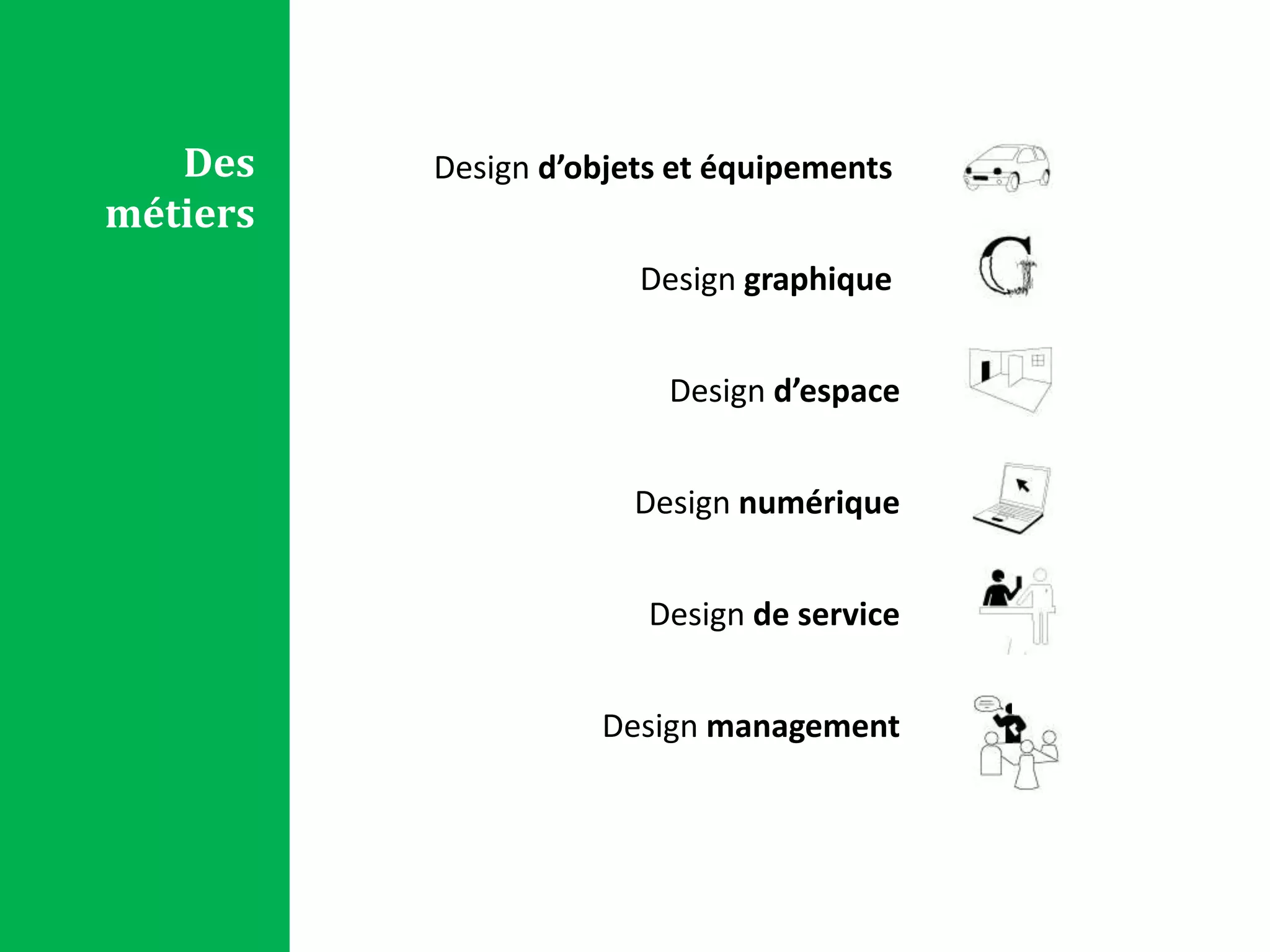 Le document traite des divers métiers du design, incluant le design d'objets, graphique, d'espace, numérique et de service. Il présente des pratiques de design globales et des cas d'application, ainsi que la création d'un laboratoire des usages pour encourager l'innovation par le design. Des actions collectives et des ateliers de sensibilisation sont également mentionnés pour engager divers publics.