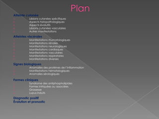 Le lupus érythémateux disséminé est une maladie auto-immune touchant principalement les femmes et se caractérisant par des manifestations variées, notamment dermatologiques, rhumatologiques, et viscérales. La pathogénie implique une hyperréactivité immune causée par des facteurs environnementaux et génétiques, avec des risques d'atteintes graves aux organes, notamment les reins et le système nerveux central. Le diagnostic repose sur les signes cliniques et les tests sérologiques, avec un suivi régulier nécessaire pour gérer les complications potentielles.