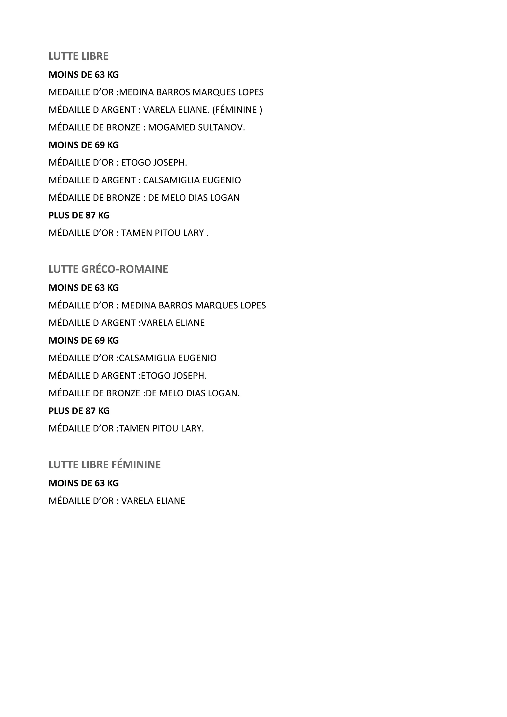 Les médailles des compétitions de lutte sont réparties en différentes catégories de poids. Dans la lutte libre, Medina Barros Marques Lopes et Etogo Joseph ont remporté l'or dans leurs catégories respectives. En lutte gréco-romaine, Medina Barros Marques Lopes et Calsamiglia Eugenio ont également obtenu des médailles d'or dans leurs catégories.