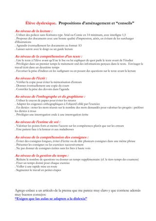 Le document propose des aménagements et conseils pour aider les élèves dyslexiques en matière de lecture et d'écriture. Il suggère des adaptations telles que l'utilisation de polices simples, la lecture préalable du texte, et un encadrement oral avant de passer au travail écrit. De plus, il insiste sur l'importance de valoriser les progrès et d'adapter les consignes et le temps accordé pour les exercices.