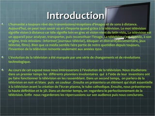 Le document retrace l'évolution de la télévision depuis ses débuts avec des inventeurs comme Maurice Leblanc et John Logie Baird, jusqu'à l'introduction des technologies modernes telles que la haute définition et la 3D. Il décrit les principes de fonctionnement des téléviseurs, notamment le tube cathodique, et comment l'image est formée par un faisceau d'électrons. Enfin, il met en lumière l'augmentation de l'audience et les progrès techniques qui ont conduit à une amélioration significative tant de la qualité que de la taille de l'image.