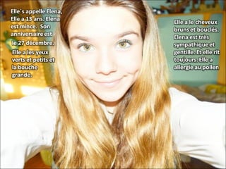 Elena Jiménez Gómez n'aime pas la violence, les œufs et le chocolat, mais elle adore danser, écouter de la musique et chanter. Elle est passionnée de football, soutient son équipe préférée et a un chien nommé Mimi, qu'elle adore. Enfin, elle a une affection particulière pour les animaux, notamment les chiens et les hamsters, ainsi que pour le melon d'eau.