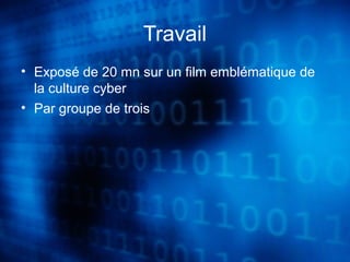 Le document présente les directives pour un exposé de 20 minutes en groupe sur un film emblématique de la culture cyber, en se focalisant sur l'analyse des personnages, des thématiques et des perspectives sur les technologies numériques. Les participants doivent structurer leur présentation de manière claire, en intégrant des supports visuels appropriés et en évitant l'improvisation. Une sélection de films recommandés est fournie pour guider la présentation et illustrer les problématiques 'cyber'.