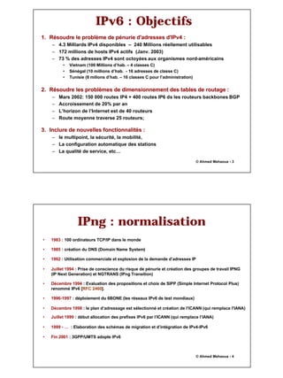 Le document aborde les défis d'IPv4, notamment la pénurie d'adresses et la saturation des tables de routage, et présente IPv6 comme solution avec des objectifs d'expansion d'adresses et d'amélioration des fonctionnalités. Il détaille également la normalisation, le déploiement, et les nouvelles caractéristiques d'IPv6, telles que l'autoconfiguration et la capacité de gestion des réseaux. Enfin, diverses applications et systèmes d'exploitation compatibles avec IPv6 sont mentionnés, ainsi que les mécanismes d'adressage associés.