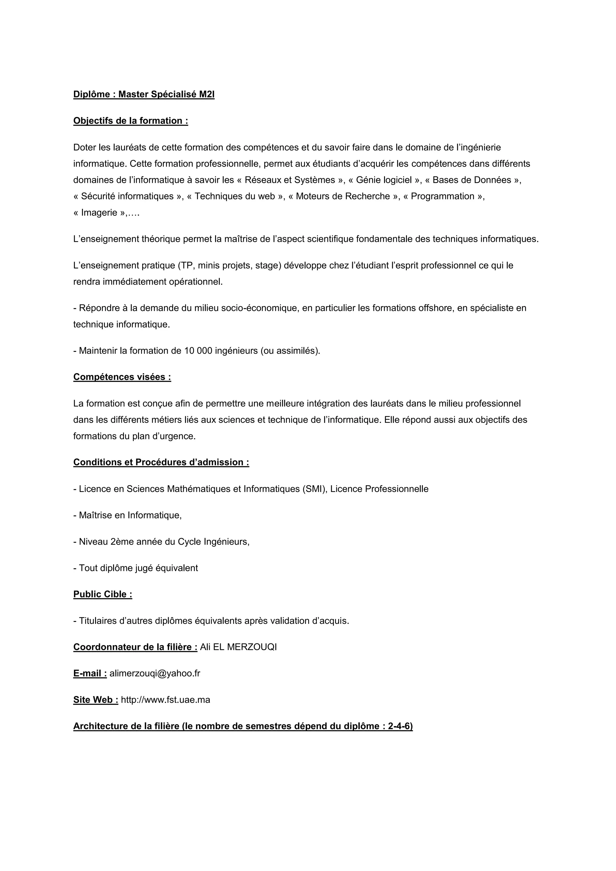 Le document présente un master spécialisé en ingénierie informatique visant à doter les étudiants de compétences variées telles que les réseaux, la sécurité informatique et le génie logiciel. La formation allie enseignement théorique et pratique pour préparer les diplômés à intégrer le marché du travail. Elle est ouverte à divers diplômes supérieurs, garantissant une large accessibilité aux candidats.