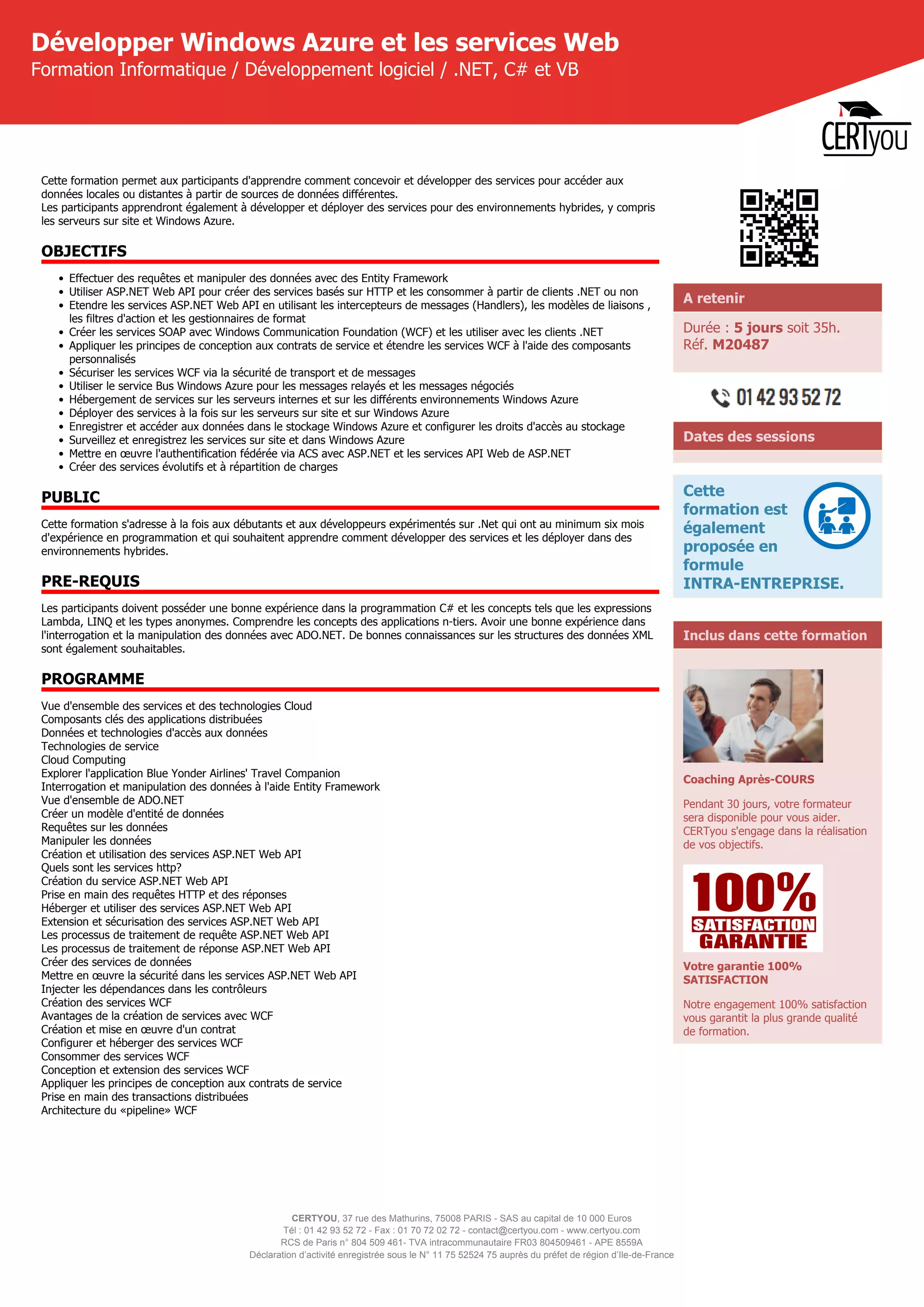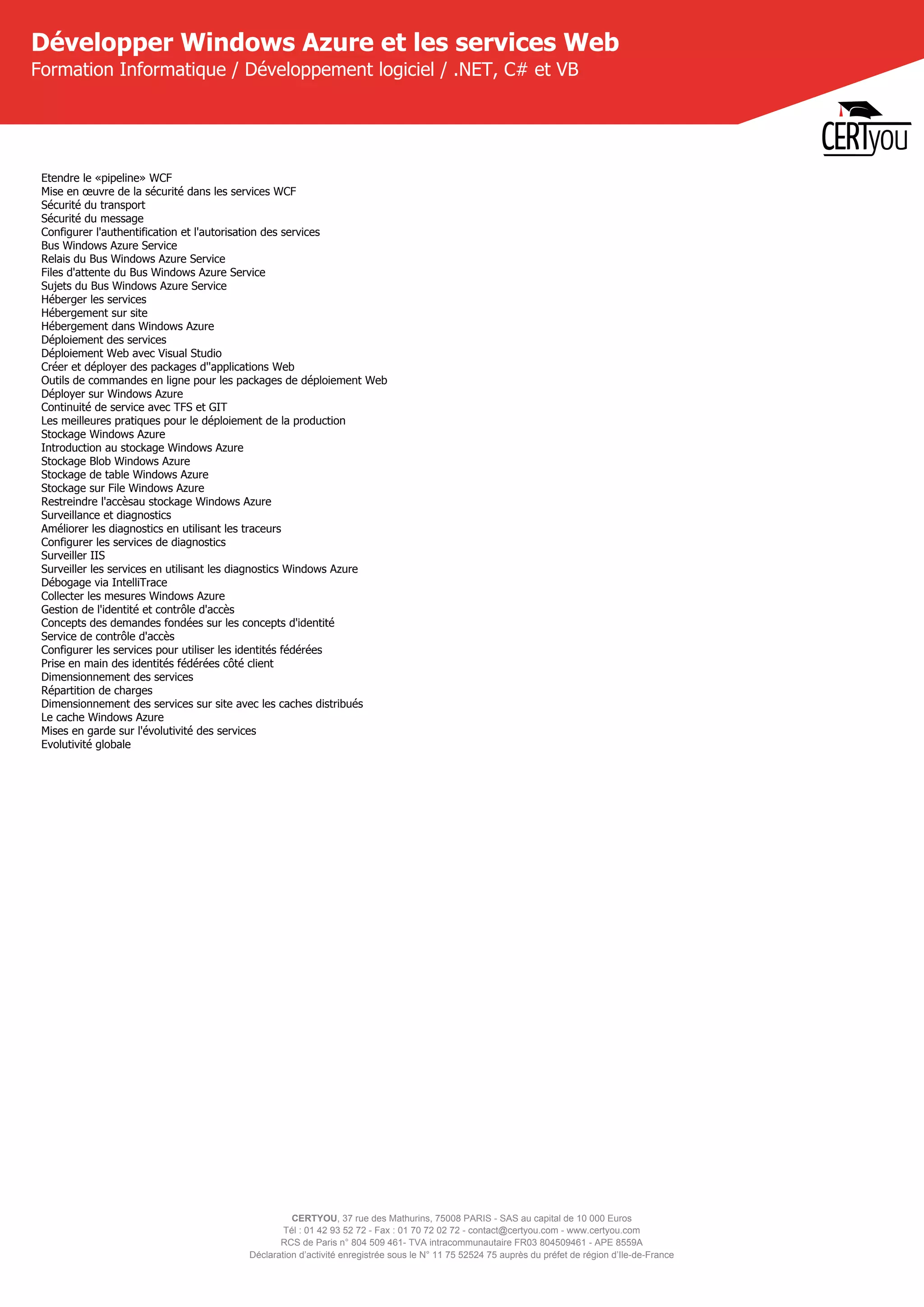 La formation proposée par Certyou, axée sur le développement avec Windows Azure et les services web, vise à enseigner la conception et le déploiement de services dans des environnements hybrides. Elle cible tant les débutants que les développeurs expérimentés, avec des prérequis en programmation C# et des concepts de manipulation de données. Le programme couvre des sujets variés allant des requêtes de données avec Entity Framework à la création de services WCF et à la sécurité des services.