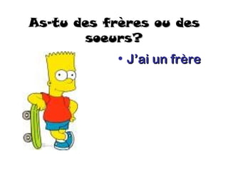 Le document décrit divers membres de la famille de Maggie Simpson, notamment ses parents, frères et sœurs, ainsi que ses grands-parents et oncles. Il fournit des exemples de phrases pour parler de la structure familiale. Le contenu se concentre sur la présentation et l'identification des membres de la famille avec des noms spécifiques.