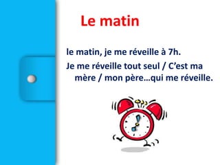Le document décrit la routine quotidienne d'un élève, incluant l'heure de réveil, le petit-déjeuner, le trajet vers le collège et les activités scolaires. Il mentionne également les repas, les devoirs et les loisirs de l'après-midi et du soir. Enfin, il précise les interactions sociales et les horaires associés à sa journée.
