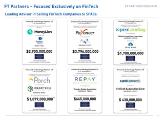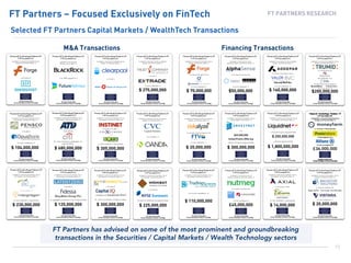 Le document présente des données concernant des transactions financières dans le secteur fintech, en mettant en avant des acquisitions et des sociétés d'investissement. Il mentionne également des récompenses et événements liés à l'industrie, tels que les 'M&A Advisor Awards' et les 'LendIt Fintech Industry Awards'. Ces éléments soulignent l'importance croissante de l'innovation financière dans le paysage économique actuel.
