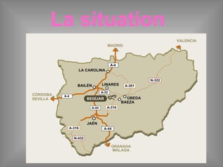 Le document décrit une localité située à 45 km de Jaén, avec une population de 3 109 habitants et une altitude de 565 m. Il mentionne des éléments historiques et artistiques, tels que la tour arabe et l'église Santiago Apostol, ainsi que des aspects gastronomiques, notamment l'huile d'olive. Enfin, il évoque la météo et des rendez-vous amoureux dans cette région.
