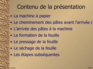 Ce document décrit en détail le processus de fabrication du papier, incluant les étapes essentielles comme l'arrivée des pâtes à la machine, la formation de la feuille, le pressage et le séchage. Il souligne également l'importance des différents équipements et techniques utilisés pour optimiser la qualité du papier produit. Enfin, il aborde les opérations subséquentes comme le calandrage et le finissage.