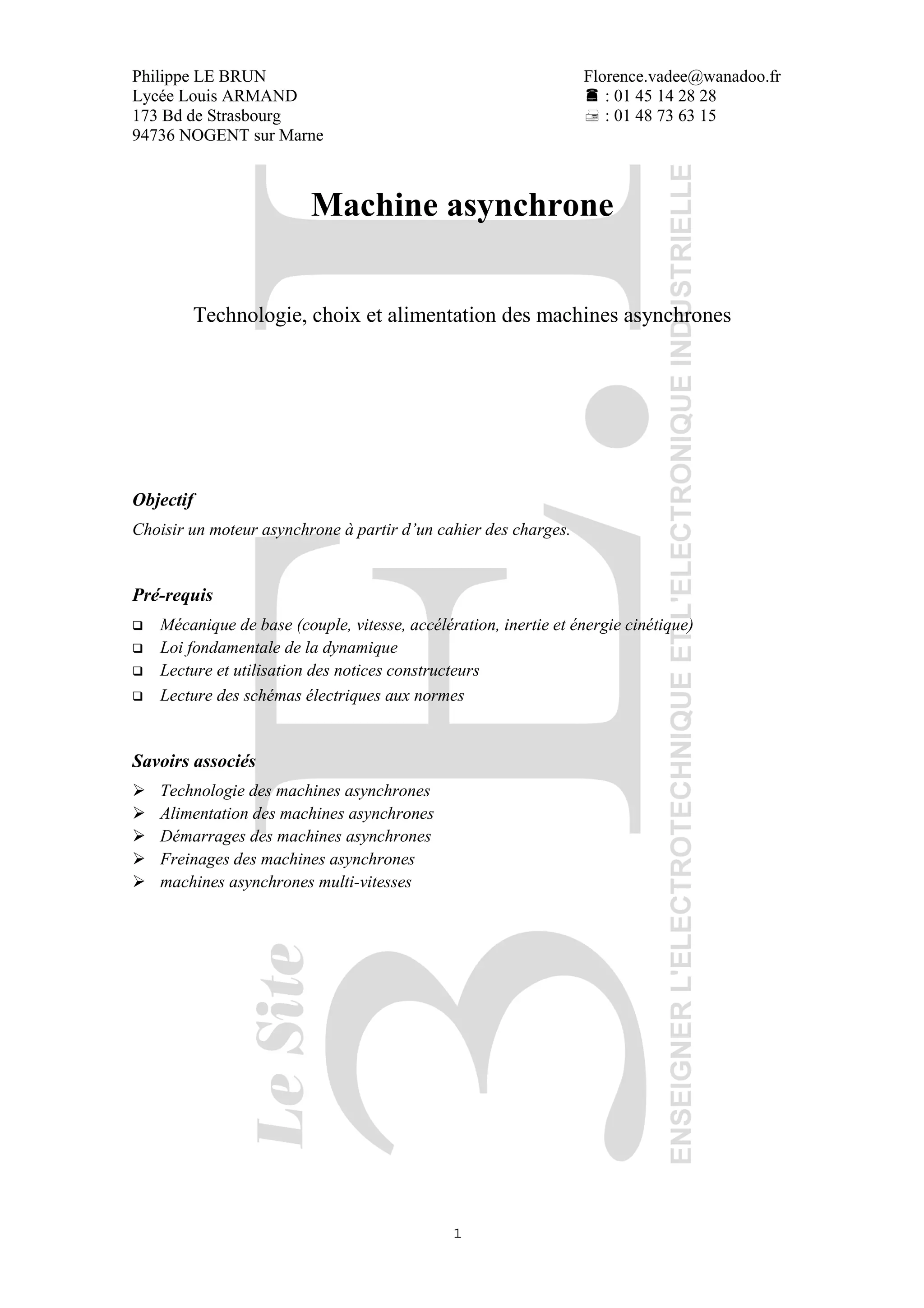 Ce document traite des machines asynchrones, en mettant l'accent sur leur structure, alimentation et méthodes de démarrage. Il explique les différentes configurations de rotors, ainsi que les techniques pour limiter le courant de démarrage. En raison de leur taille réduite, de leur rendement et de leur fiabilité, les moteurs asynchrones sont largement utilisés dans l'industrie.