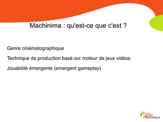 Le machinima est un genre cinématographique utilisant des moteurs de jeux vidéos pour créer des films. Des exemples incluent 'Blood Spell', 'French Democracy' et 'Red vs Blue'. Le document fournit également des liens vers des sites dédiés au machinima.