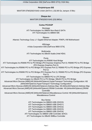 Le document fournit un rapport détaillé sur la configuration matérielle et logicielle d'un ordinateur fonctionnant sous Windows XP Professionnel, incluant des informations sur le système d'exploitation, le processeur, la mémoire, et les périphériques connectés. Il mentionne un processeur AMD Athlon 64 X2 6400+, 2 Go de mémoire DDR2, et une carte graphique Nvidia GeForce 9800 GTX. De plus, des détails sur le stockage, tels que des disques durs Maxtor et les spécifications de la carte mère, sont également inclus.