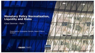 Le document présente des réflexions sur la normalisation de la politique monétaire et ses implications sur l'économie mondiale, signalant une fragilité accrue face aux risques politiques et économiques. Il souligne un changement vers des coûts de financement plus élevés, une volatilité accrue et une croissance plus faible, dans un contexte de resserrement quantitatif. L'analyse indique que, malgré des tentatives de relance en Chine, l'impulsion de crédit mondiale reste faible, marquant une approche vers la fin d'un cycle économique de près de dix ans.