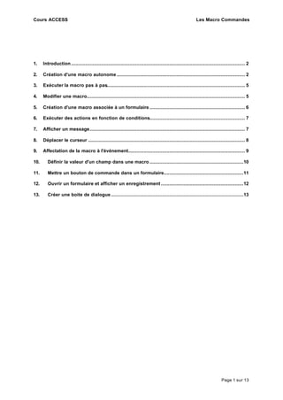 Le document explique comment créer et gérer des macros dans Access pour automatiser des tâches. Il aborde la création de macros autonomes, l'exécution pas à pas, les conditions d'exécution, et l'assignation de macros à des événements dans des formulaires. Les macros permettent également d'afficher des messages d'erreur et de modifier le contenu des champs de manière dynamique.