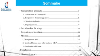 Le rapport de stage présente l'entreprise STEG, spécialisée dans la production, le transport et la distribution d'électricité et de gaz en Tunisie. Le stage a permis à l'étudiante d'appliquer ses connaissances théoriques et d'améliorer les services administratifs de STEG, notamment à travers la gestion des réseaux et des applications informatiques. Le rapport souligne également l'importance de l'innovation et de l'adaptation aux défis du marché de l'énergie.