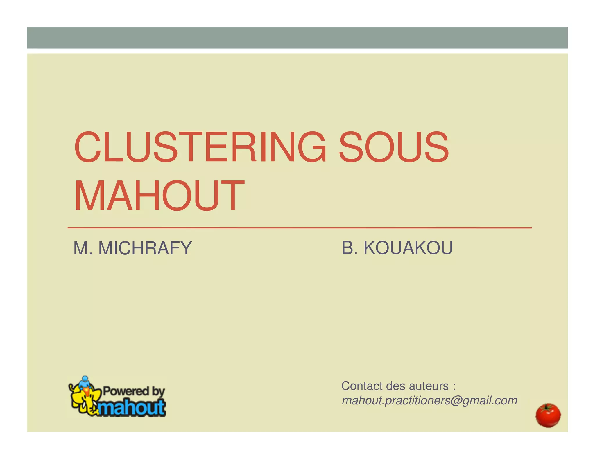 Ce document présente Mahout, une API Java dédiée au clustering et à d'autres algorithmes d'apprentissage, comme la recommandation et la classification. Il discute des concepts de clustering, des algorithmes disponibles tels que K-means et Canopy, ainsi que des méthodes d'évaluation des clusters. Le document aborde également l'installation, la configuration et l'utilisation des algorithmes en ligne de commande.