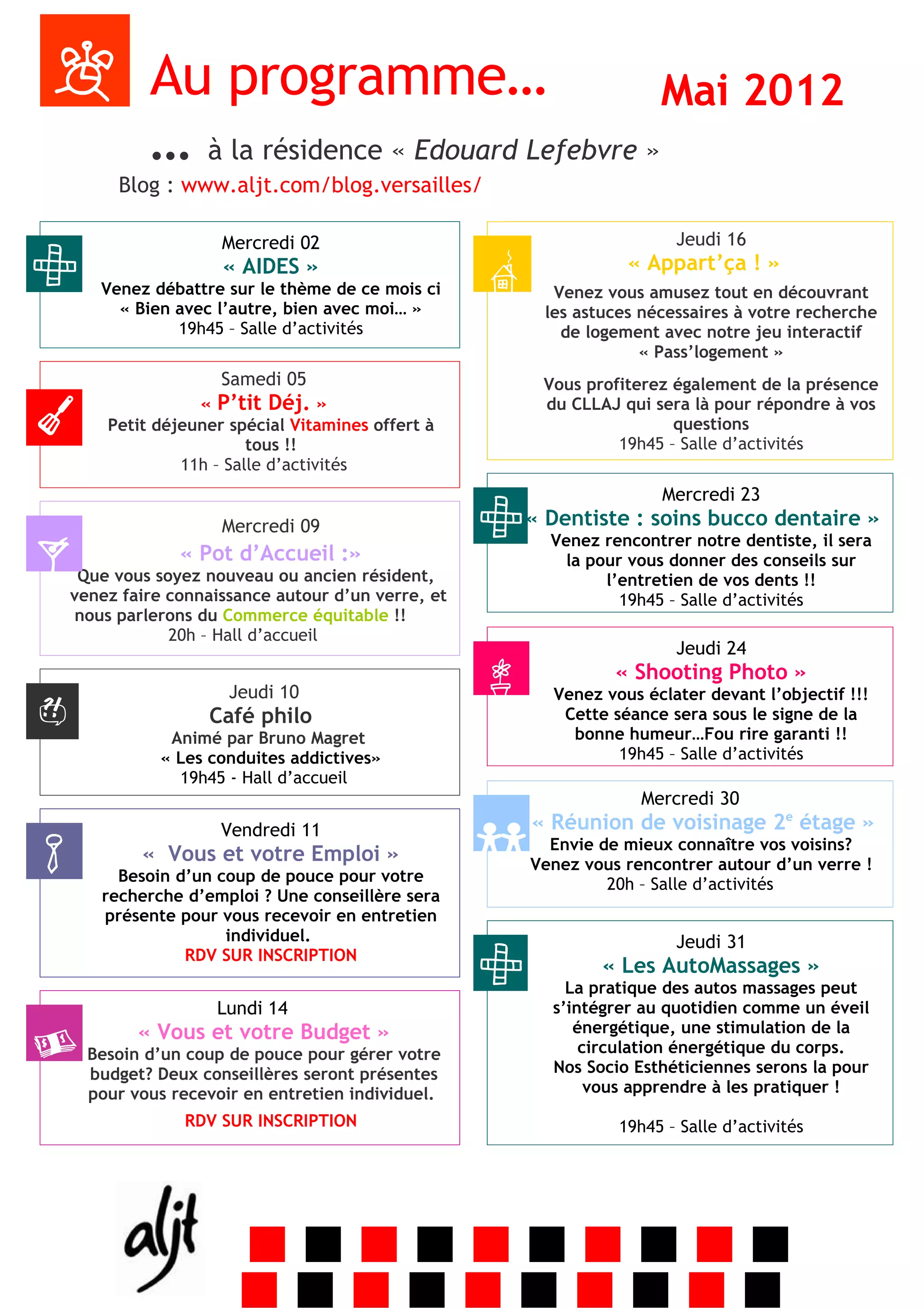 Le document présente le programme d'activités de la résidence « Edouard Lefebvre » pour mai 2012, incluant des ateliers, des rencontres et des débats sur divers thèmes tels que la santé dentaire et la recherche d'emploi. Des événements sociaux, comme des pots d'accueil et des séances de shooting photo, sont également prévus pour favoriser les interactions entre résidents. Chaque activité est programmée à des horaires spécifiques dans des salles désignées.