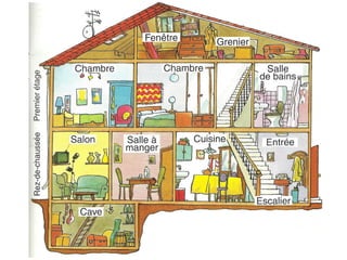 Le document présente les différentes pièces d'une maison, en soulignant que chaque maison a des caractéristiques uniques. Il énumère divers espaces tels que la salle de bain, le garage, et la cuisine, et souligne l'importance du vocabulaire associé. La question finale interroge sur le contenu de chaque pièce.