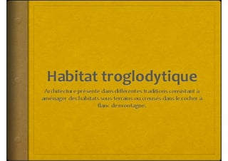 Le document traite des habitats troglodytiques à travers le monde, notamment en Égypte, en France, en Tunisie, en Italie, au Mali et en Turquie, mettant en évidence leur histoire et leur utilisation par différentes cultures. Un exemple détaillé est donné sur un résident vivant dans une grotte aménagée près de Marseille, qui conserve des propriétés naturelles remarquables. Ces habitats, souvent creusés dans la roche, témoignent d'un mode de vie ancien et de l'adaptation des humains à leur environnement.