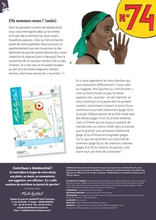 Le numéro 74 du journal de quartier Malakocktail, coordonné par la ville de Nantes, explore le thème de l'identité et du territoire à Malakoff, en invitant les habitants à participer activement au contenu et aux initiatives locales. Le journal met également en avant des événements comme 'Fêtons Jardins' et aborde des sujets sensibles tels que la violence, tout en cherchant à valoriser la vie communautaire et à encourager le soutien aux projets citoyens. Il souligne l'importance des échanges et de la solidarité entre les résidents pour renforcer le tissu social du quartier.
