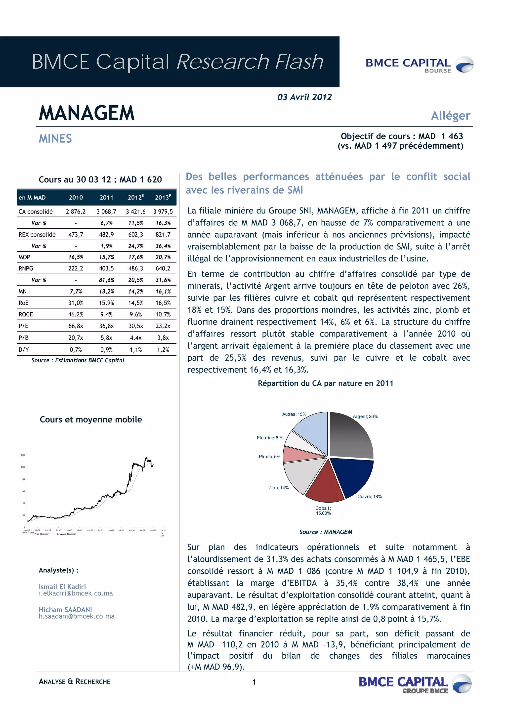 Le document présente une analyse financière de la société Managem, concernant ses performances en 2011 et ses prévisions jusqu'en 2013. Malgré une hausse de chiffre d'affaires et un résultat net positif, l'entreprise fait face à des défis tels que des conflits sociaux et des couvertures de prix défavorables. Il est recommandé d'alléger les positions dans l'action en raison d'une évaluation déjà optimiste par rapport aux performances attendues.