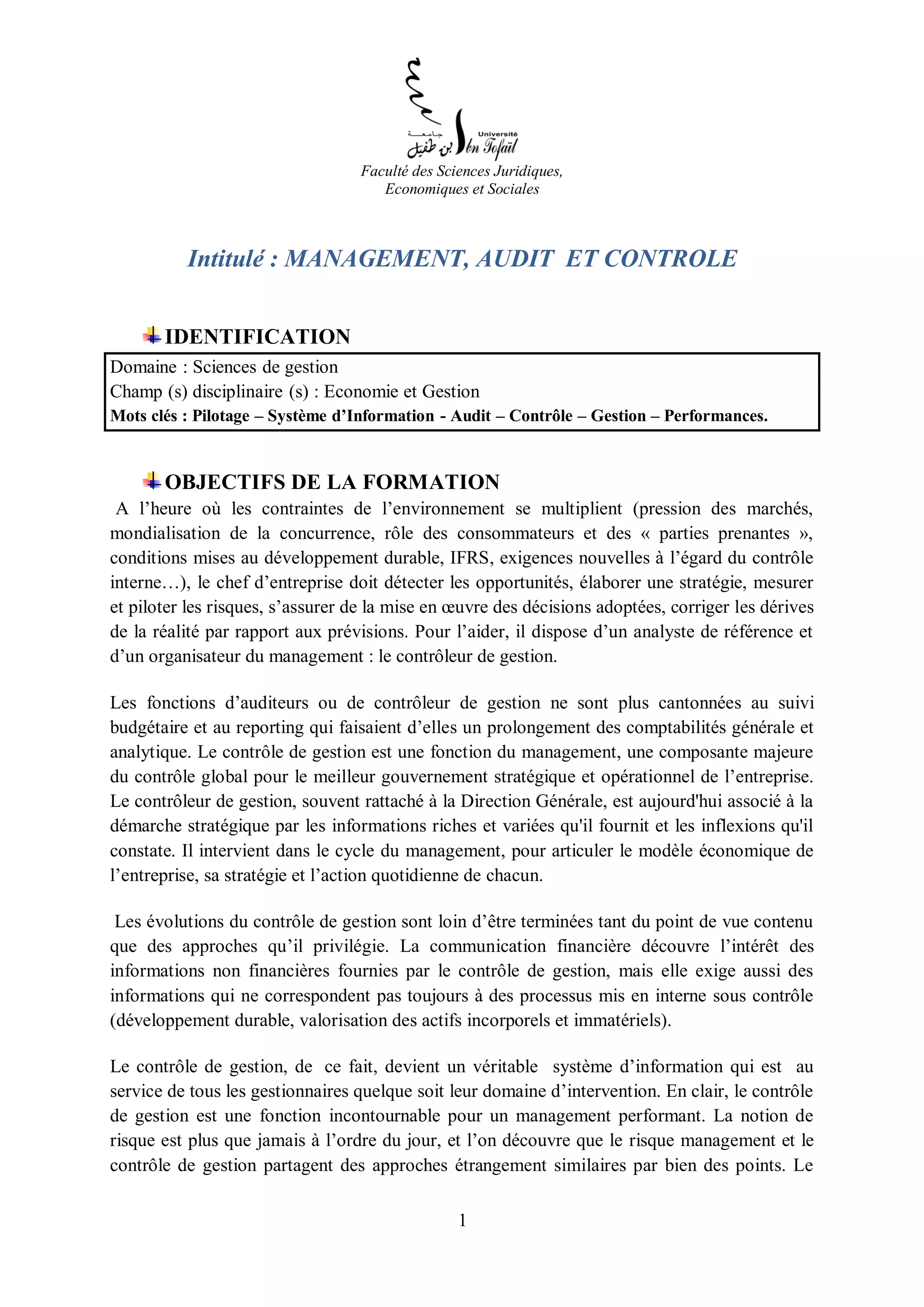 Le document présente un programme de formation en management, audit et contrôle, axé sur l'évolution du contrôle de gestion comme fonction essentielle pour le pilotage et la performance des entreprises dans un environnement compétitif et en mutation. Il souligne l'importance du contrôleur de gestion dans l'élaboration des stratégies et la mesure des performances, ainsi que les débouchés professionnels offerts par cette formation. Enfin, il mentionne des partenariats universitaires et socio-professionnels pour favoriser l'échange et l'insertion professionnelle des étudiants.